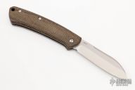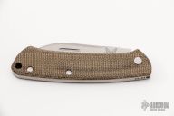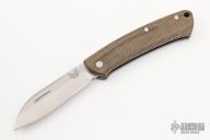 This Benchmade Proper slip joint folder is a modern take on a classic gentleman's knife design. This model features Green Canvas Micarta scales paired with a stonewashed sheepsfoot blade made from premium CPM-S30V stainless steel. Skeletonized stainless steel liners offer reduced weight for comfortable everyday carry in a pocket or pack. A lanyard hole in the handle accommodates key ring or lanyard attachment. Excellent condition.