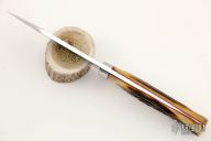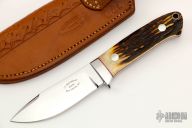 This Nesmuck Hunter by Jim Martindale features a mirror polished blade with false top edge, .153" blade stock and 1.110" blade depth, full tapered tang construction. The handle has a mirror polished stainless steel guard, stag scales with red liners/spacers, lanyard hole at the butt. Comes with a hand tooled brown leather sheath. Excellent condition. #125 on the blade.