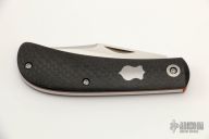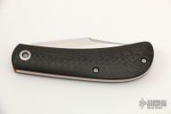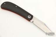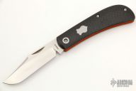 This Lanny's Clip by Enrique Pena features a satin finished blade with nail nick. The handle has carbon fiber covers over orange G-10 liners, stainless steel escutcheon, pivot collars and spring. Half-stop, flush in all positions. Comes with a zippered case. Excellent condition.