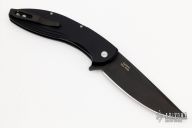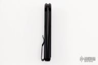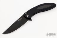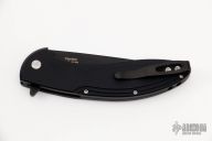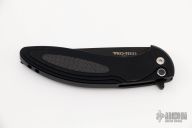 This Cambria flipper by Pro-tech features a black blade with flipper. The handle has a black aluminum frame with carbon fiber inlay in the frame and push button, tip up black deep carry stainless steel clip. Rides on bearings, nice detent, lockup and blade seating. Has some light scuffs on the frame, and blade, otherwise excellent condition.