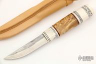 This Pukko by Veikko Hakkarainen features a scandi ground straight point blade with hammered flats, .119" blade stock and .750" blade depth, hidden tang construction. The handle is made from scrimshawed stag and wood with leather spacers. Includes leather sheath with loop. Excellent condition.
