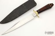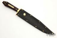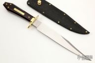 This is a discontinued Bill Bagwell designed Gambler Bowie, made by Ontario Knife Company. Features a satin finished clip point blade with sharpened top edge, .310" blade stock and 1.264" blade depth, hidden tang construction. The handle has a brass guard/collar/studs, and a dymondwood grip. Includes all original box and black leather sheath. Excellent condition.