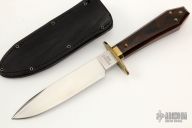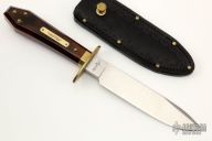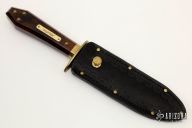 This is a discontinued Bill Bagwell designed Drifter Bowie, made by Ontario Knife. Has a satin spear point blade, .300" blade stock and 1.220" blade depth, hidden tang construction. Wooden coffin handle with nameplate and brass pins. Black leather sheath with brass rivets and stud. Has a couple very light scratches, otherwise excellent condition. Comes with original box.