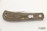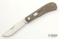 This Large Trapper from Pepe Jalomo features a hand rub satin finish clip point blade with a single nail nick. The handle is comprised of green micarta covers over stainless steel liners with a stainless steel escutcheon. Stainless steel backspring. Includes a zipper case, and COA. New from maker.