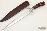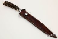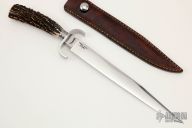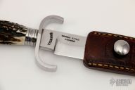 This Devil's Daughter Bowie from Bill Bagwell features a mirror polished blade with sharpened top edge, .295" blade stock and 1.265" blade depth, hidden tang construction. The handle has a steel guard and spacer with a nice stag grip. Comes with original brown leather sheath. Both the knife and sheath are marked "DOUBLE EXTRA FORGED". Excellent condition. Comes with a zippered case.