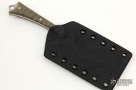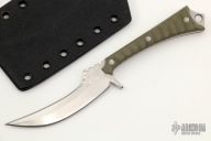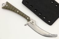 This Persian EDC by Richard Derespina features a hand rub satin finished blade with notched thumbrest and jeweled flats, sharpened top edge, .129" blade stock and 1.016" blade depth, full tang construction. The handle has green G-10 scales. Comes with a kydex sheath. Excellent condition; a few light scratches on blade.
