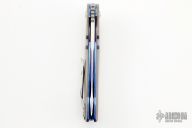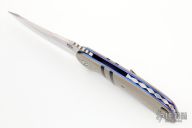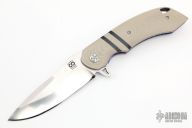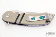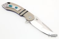 This Olamic Wayfarer W695 features a satin finish drop point blade with swedge, notched thumbramp and flipper. The handle has tan G-10 scales with black G-10 stripes, anodized and jeweled titanium liners, titanium tip up pocket clip with 3 "AAA Pin Point Opals", anodized/fileworked titanium backspacer. Includes padded and zippered case and CoA. Has a couple light scratches, otherwise excellent condition.