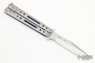 This Model 1 Balisong by Korth Cutlery features a clip point satin finished blade with false top edge. The handles are orange peel finished titanium with anodized insides, has t-latch. #19 on the blade. Excellent condition. Comes with a zippered case.