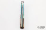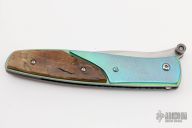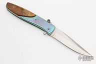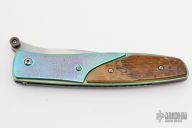 This linerlock flipper by Randall Gilbreath features a hand rub satin finished clip point blade with checkered thumb studs and notched flipper. The handle has anodized and orange peel finished titanium bolsters, bark mammoth ivory scales, black linen micarta backspacer and anodized titanium liners with jeweled interiors. Nice lockup, blade is off center and touches the liner. Has some light scratches, otherwise excellent condition.