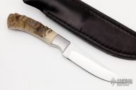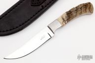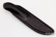 This knife by Robert Crowder features a mirror polished blade with .156" blade stock and 1.065" blade depth, full tapered tang construction. The handle has dovetailed stainless steel bolsters and rams horn scales. Comes with a black leather sheath. Excellent condition.