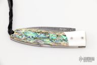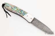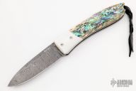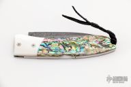 4" closed lockback. 2 7/8" Damascus steel drop point blade. Abalone handles with mother of pearl bolster. Fileworked backspring. Lanyard slot with black leather lanyard. Cedar storage block with cardboard sleeve. Made in Italy. Comes with original box and papers. Has a couple marks on the blade and handle, otherwise excellent condition.
