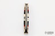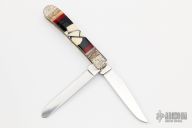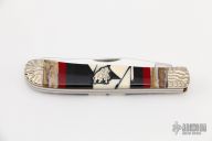 This two blade trapper by Case has been modified by Brian Yellowhorse and is #035 of 100 made. It features two mirror polished blades both with nail nicks. The handle has carved nickel silver bolsters, mosaic covers made of mammoth tooth, mammoth ivory, jasper and buffalo horn, brass liners and stainless steel springs. Comes with a felt pouch. Excellent condition.