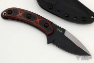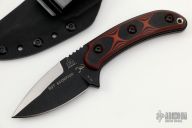 This SGT Scorpion from TOPS Knives features a black spear point blade with satin swedge and notched thumbrest. The handle is comprised black and red G-10 scales. Comes with a kydex sheath with belt clip. Excellent condition.