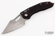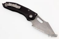 This Stitch Auto by Microtech Knives features an Apocalyptic finished blade and false top edge, partial serrations, notched thumb and finger rests. The handle has a black anodized and milled aluminum handle with a bead blasted titanium backspacer and a bead blasted stainless steel clip, tip up carry, lanyard hole at the butt. Comes with original box and papers. S/N of 1269 and dated 05/2017. Excellent condition.