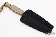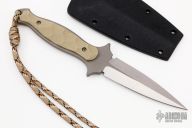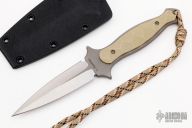 This Dagger by Les Voorhies features a satin finished double edged blade with bead blasted flats and tang, .145" blade stock and .909" blade depth, full tang construction with tan G-10 scales. Comes with a kydex sheath. Excellent condition.
