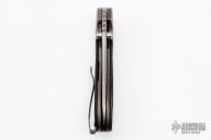 This AWT linerlock flipper by Brad Southard is a TAD Gear edition, it features a tumble  finished blade with notched thumbrest and flipper, dual thumbstuds. The handle has tumbled and anodized titanium bolsters, tip up clip and liners, black G-10 scales and backspacer. Smooth flipper opening that requires no wrist action, rides on IKBS. Nice detent, blade seating and lockup. Excellent condition. Comes with original box.