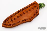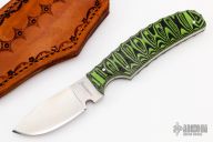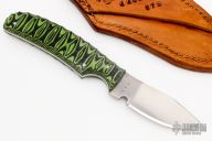 This skinner by Ron Jamieson features a satin finished blade with .140" blade stock and 1.001" blade depth, full tang construction. The handle has black/green G-10 scales, stainless steel pins. Comes with a hand tooled brown leather sheath. Excellent condition.