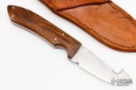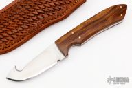 This Guthook Skinner by Ron Jamieson features a satin finished blade with .146" blade stock and 1.132" blade depth, full tang construction. The handle has ironwood scales, stainless steel pins. Comes with a hand tooled brown leather sheath. Excellent condition.