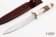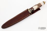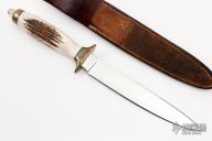 This Fighter by Randall Gilbreath features a satin finished blade with fileworked spine, .175" blade stock and 1.010" blade depth, hidden tang construction. The handle has a brass guard and butt with a stag grip. Comes with a brown leather sheath. Excellent condition.
