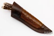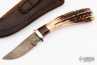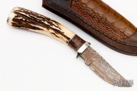 This Skinner by Herb Derr features a Damascus blade with file worked spine, .150" blade depth and .893" blade depth, hidden tang construction. The handle is comprised of a nickel silver guard and pommel with burl and nickel silver spacer and a stag grip. Includes a brown leather sheath with ostrich leg skin inlay. Excellent condition.