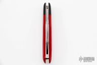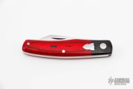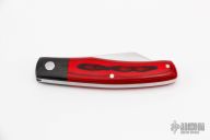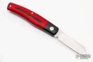 This Whittler by David Taber features a hand rub satin finished blade with nail nick. The handle has black carbo quartz bolsters, red/black carbo quartz covers, stainless steel escutcheon, stainless steel liners and spring. Comes with COA dated April 1 2019. Has a couple light scratches and spots on the blade, otherwise good condition.