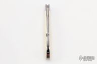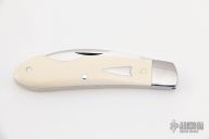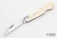 This custom slip joint from David Taber features a hand rub satin finished wharncliffe blade with a nail nick. The handle has stainless steel bolsters, mammoth ivory covers with stainless steel liners, escutcheon and spring. Flush in the closed, half stop and open position. Excellent condition.