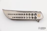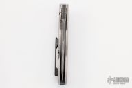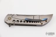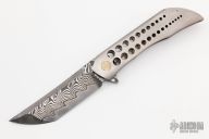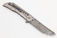 This Phantom by Merriken Knives features a Chad Nichols 3V core San Mai Damascus blade with notched thumbrest and flipper. The handle has a orange peel finished titanium frame with zirconium tip up clip with hidden screws and a zircuti backspacer. Comes with original zippered case and COA dated 09-10-2020. Rides on bearings, nice detent, lockup and blade seating. Comes with a custom pivot tool and a padded zippered case.  Excellent Condition.
