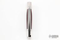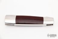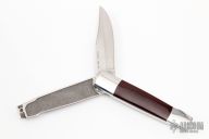 This Barry Wood swing lock folder features a satin finish blade and satin polished stainless steel frame with maroon linen micarta scales. This is a very unique scissor opening folder, which when the blade is fully open and locked in place is almost a fixed blade knife. The handle is nicely contoured for a comfortable grip. Opening is accomplished by lightly pressing down and outward at the rear indentation on the spine, which releases the locking pin and allows one side of the handle and the blade to rotate down then forward until the blade locks in the forward position. The one side of the handle continues to rotate back until it locks in place. Closing requires the same slight thumb pressure at the indentation to release the locking pin, then the one side of the handle is rotated back and around, catching the blade and aligning both with the other side of the handle in a locked closed position. Nice function. Has a few light scratches, otherwise excellent condition for age. #1055 inside frame. Made in the 1970s. Comes with original tube and paperwork.