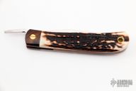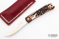 This friction folder by Yoshimi Kotoh features a satin finished blade with friction folder style opening. The handle has ironwood bolsters, stag scales and ironwood liners and trough, lanyard hole at the butt. Comes with a leather pouch. Excellent condition.
