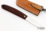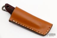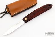 This Higonokami by Seiji Yanagida features a VG-10 San Mai Damascus blade. The handle is one piece of ruby wood with textured finish, lanyard hole. Comes with a leather slip sheath. Excellent condition.