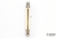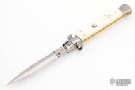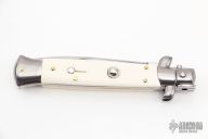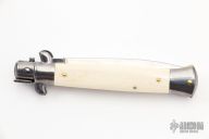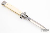 This 9" Swivel Bolster by Frank Beltrame features a polished dagger ground blade with false top edge. The handle has stainless steel bolsters, front and rear, bone scales, brass liners, stainless spring. Excellent condition.