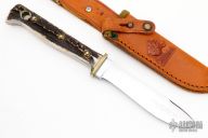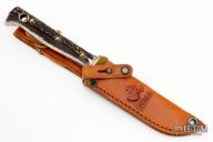This Hunter's Pal by Puma Knives features a satin finished blade with notched spine and false top edge, .153" blade stock and .814" blade depth, full tang construction. The handle has a brass guard with stag scales. Includes original leather sheath. #11071 on the guard. Excellent Condition. Made in 1970.