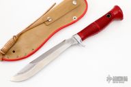 This Sea Hunter by Puma Knives features a recurved drop point blade with sharpened top edge and notched thumb rest. 0.197" blade stock and 1.096" blade depth. The handle is comprised of an aluminum guard and ribbed rubber handle with lanyard tube and leather lanyard over hidden tang construction. Includes vinyl sheath with belt loop and original box. Excellent condition. Made in 1970. #72172