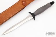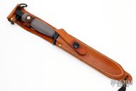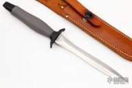 This Mark II #022515 by Gerber has a satin finished double-edged blade with hidden tang. Blade stock is .238", depth is .856". Handle is Grey "Cat's Tongue" textured aluminum with black double guard and black butt cap - with lanyard hole. Comes with brown leather sheath. Excellent condition. Made in 1971