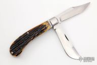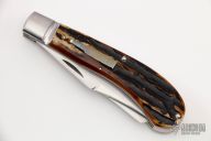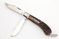 This Two blade trapper from Dewayne Chancellor features hand rub satin finish blades with nail nicks. The handle has satin stainless steel fluted bolster, liners, and spring, brass/copper/stainless steel escutcheon, jigged bone covers. Half stops, flush in all positions. Very nice work. Comes with a zippered case. Excellent condition.