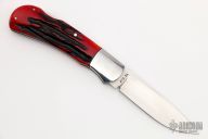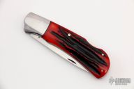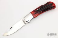 This Lockback by Ray Cover features a hand rub satin finished blade with a nail nick. The handle has dovetailed and polished stainless steel bolsters, red jigged bone covers with nickel silver pins and black liners, stainless steel liners and backspacer. Has a few light scratches, otherwise excellent condition.