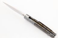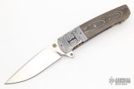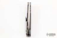 This HB07 linerlock flipper by Herucus Blomerus features a hand rub satin finished blade with polished flats and flipper. The handle has Damasteel bolsters, Gold Camo Fat Carbon scales, anodized titanium liners with fileworked spines, black G-10 backspacer and a tip up 3D titanium clip. Blade is centered when closed, nice detent and lockup. Very smooth flipping action, rides on IKBS. Comes with velcro case and COA. New from maker.