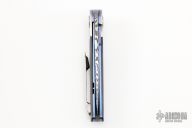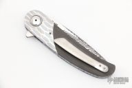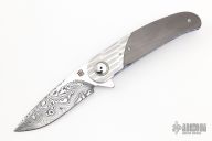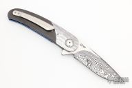 This HB06 flipper by Herucus Blomerus features a Vinland Damasteel blade with polished flats and notched flipper. The handle has Tire Tread Damascus bolsters, unidirectional carbon fiber scales, anodized titanium liners with fileworked spines, Damasteel backspacer and a tip up 3D titanium clip. Blade is centered when closed, nice detent and lockup. Very smooth flipping action, rides on IKBS. Comes with nylon velcro case and COA. New from maker.