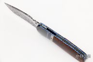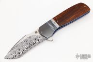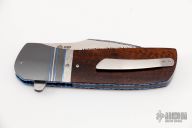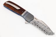 This HB16 Linerlock Flipper by Herucus Blomerus features a Damasteel blade with polished flats and a flipper. The handle has fluted and textured zirconium bolsters, Arizona Desert Ironwood scales, anodized titanium liners with fileworked spines, carbon fiber backspacer and a tip up 3D titanium clip. Blade is centered when closed, nice detent and lockup. Very smooth flipping action, rides on dual row Ceramic IKBS. Comes with nylon velcro case and COA. New from maker.