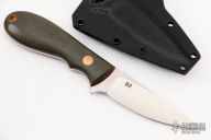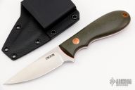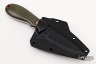 This Black Widow Caper by Dan Crotts features a satin finished blade, .126" blade stock and .839" blade depth, full tang construction. The handle has green micarta scales over red liners and a single copper pin. Comes with a kydex sheath. New from maker.