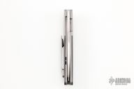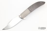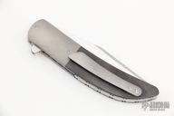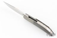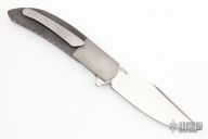 This HB20 linerlock flipper by Herucus Blomerus features a hand rub satin finished blade with polished flats and flipper. The handle has bead blasted zirconium bolsters, Chatoyant carbon fiber scales, blasted and textured titanium liners with jimping, hand rub satin finished M390 backspacer and a tip up 3D titanium clip. Blade is centered when closed, nice detent and lockup. Very smooth flipping action, rides on IKBS. Comes with velcro case and COA. New from maker.