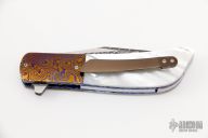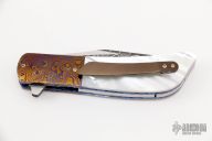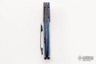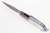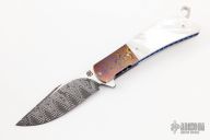 This HB19 Kolove linerlock flipper by Herucus Blomerus features a Mike Norris Stainless Damascus blade with polished flats and flipper. The handle has MokuTi bolsters, beautiful mother of pearl scales, anodized titanium liners with fileworked spines, hand rub satin finished M390 backspacer with hidden bottle opener, and a tip up 3D titanium clip. Blade is centered when closed, nice detent and lockup. Very smooth flipping action, rides on IKBS. Comes with velcro case and COA. New from maker.