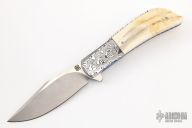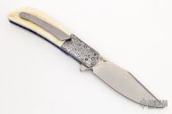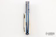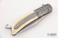 This HB19 Kolove linerlock flipper by Herucus Blomerus features a stonewashed blade with polished flats and flipper. The handle has Damasteel bolsters, warthog ivory scales, anodized titanium liners, fileworked M390 backspacer with hidden bottle opener, and a tip up 3D milled titanium clip. Blade is centered when closed, nice detent and lockup. Very smooth flipping action, rides on IKBS. Comes with velcro case and COA. New from maker.