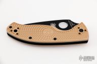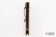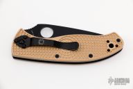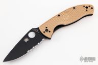 This knife features a black partially serrated drop point blade with thumb hole and notched thumbrest. The handle has tan FRN scales, black stainless steel liners, and a 4-way reversible stainless steel clip. Comes with original box and papers. Excellent condition.