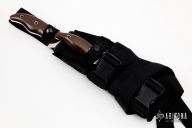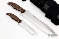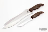 This Prototype David and Goliath set is the largest combat knife Mercworx has made to date. The blade is cut from S30V steel and then hand ground with the traditional Mercworx double recurve. Hand rub satin finished blades with sharpened top edges, notched thumb rests. .241" blade stock on Goliath and .184" blade stock on David. Full tang construction. Brown canvas micarta scales with hollow tube pins. Comes with black nylon sheaths for both knives that fit together or can be worn separately. Has a few light scratches, excellent condition.
