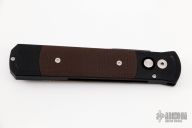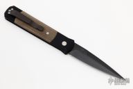 The Pro-Tech Godfather auto is one of the most popular designs in automatic knives. Features a double ground blade with a false top edge and a solid button release opening and closing. This model has a black aluminum handle with green micarta inlays, and a black DLC blade. Comes with original box and papers. Excellent condition.
