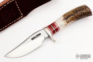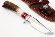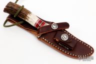 The miniature Model 27 debuted in Randall's 2012 75th anniversary catalog and is the first catalog miniature model. This knife has a satin finished stainless steel blade, nickel silver guard and butt plate, and a stag handle with red, duralumin, white, red linen micarta, black and brass spacers. Comes with a brown leather sheath with miniature stone. Comes with original paper wrapping. New from maker.