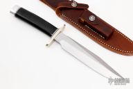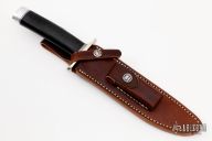 This Model 1-7 from Randall Made Knives features a satin finished clip point blade with sharpened top edge, .211" blade stock and 1.291" blade depth, hidden tang construction. The handle is comprised of a nickel silver  guard, black/duralumin spacers, black linen micarta handle and duralumin pommel. Comes with brown leather sheath and original paper wrapping. New from maker.