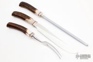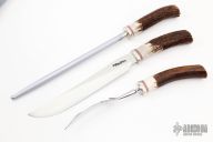 This Carving Set by Randall Made Knives features a satin finished stainless steel blade with .180" blade stock and 1.191" blade depth, hidden tang construction. The handle has a nickel silver guard, stag grip and red/white/blue spacers. Designed to meet every requirement as the ideal table knife, it is rustproof and will resist staining as ordinary blades do when used in carving meat. Complete with matching handled Sharpening Steel and Fork. A three-compartment felt case is included. The carving set should not be placed in a dishwasher." Comes with original paper wrapping. New from maker.