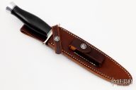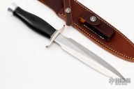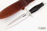 This Model 2-7 by Randall Made knives features a satin finished double edged blade, .207" blade thickness and 1.277" blade depth, hidden tang construction. The Model 2 is a heavily made dagger or dirk. Nickel silver guard and duralumin butt, black linen micarta grip with black/duralumin spacers. Comes with a brown leather sheath and original paper wrapping. New from maker.